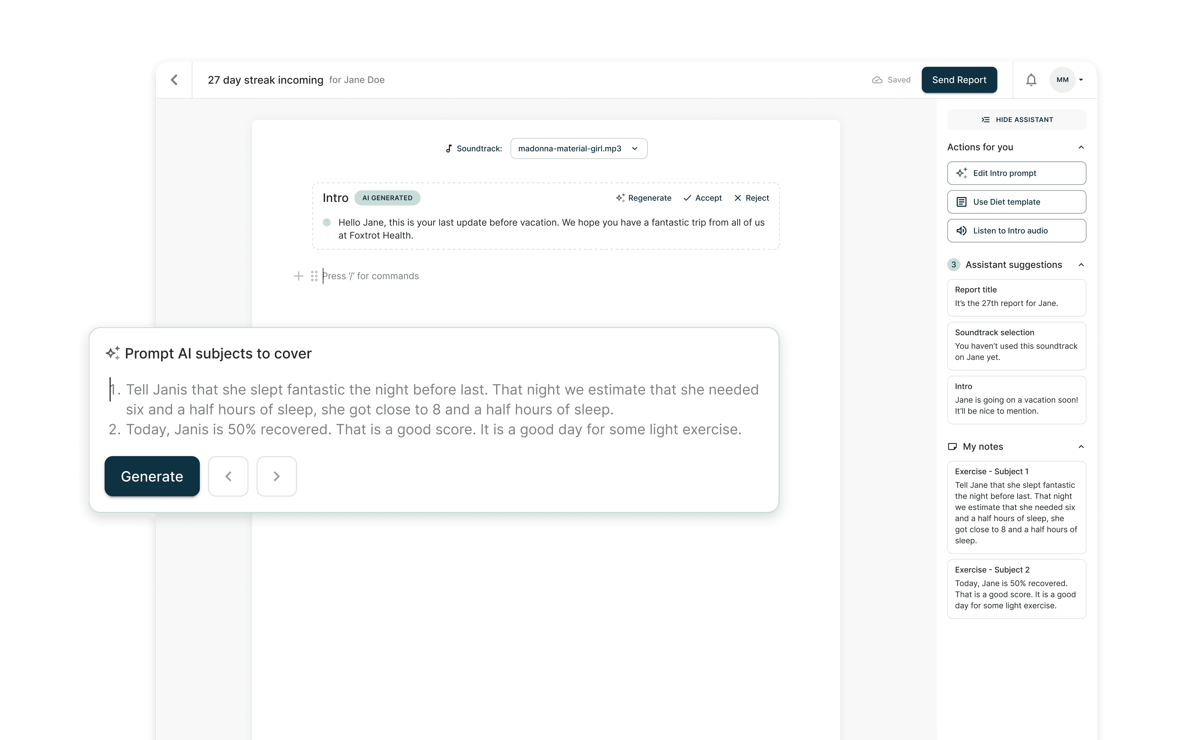 Provides editable content suggestions, addresses users' struggle with report generation by offering a head start, automating 50% of the process to increase business efficiency.